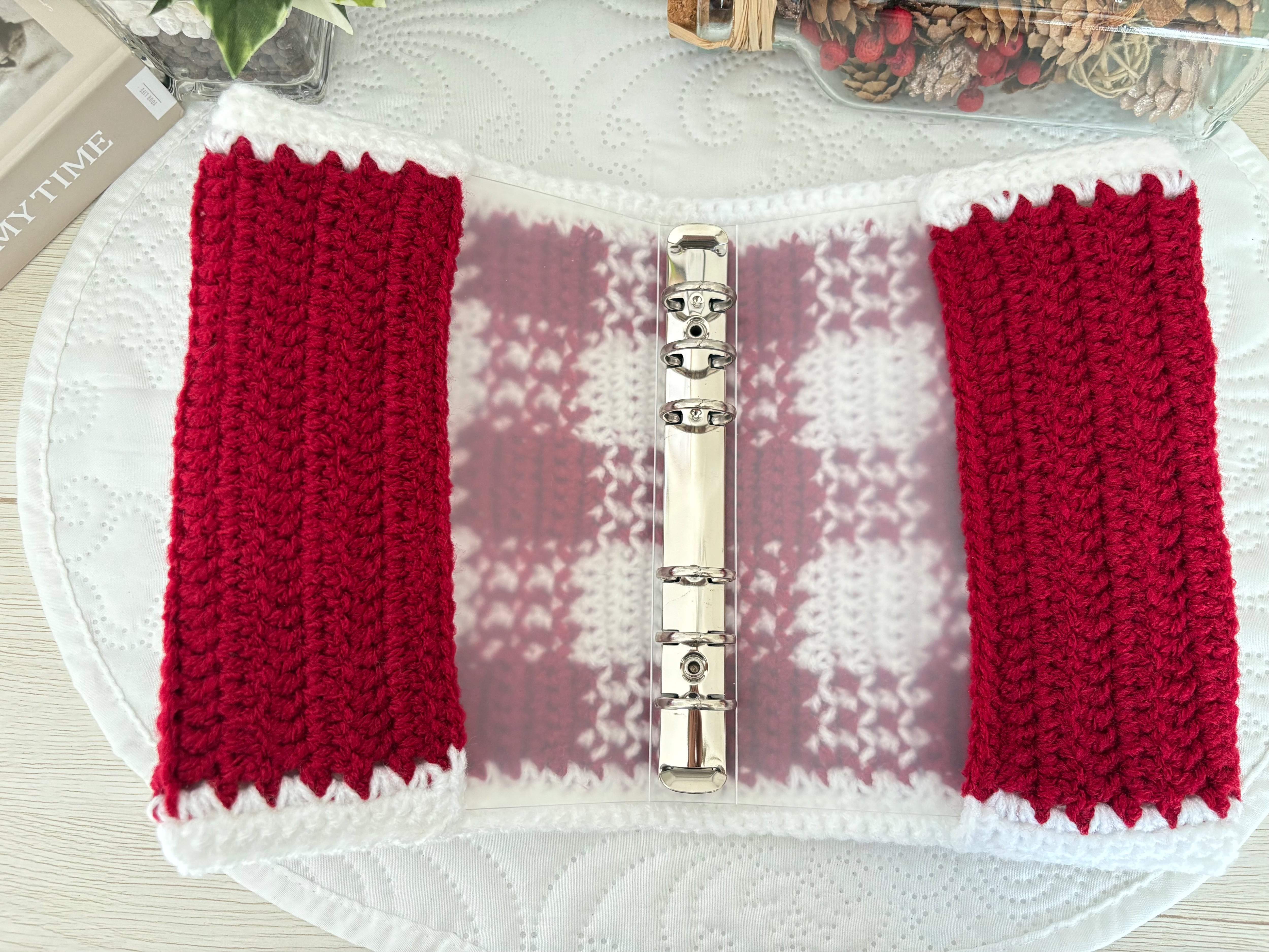 1つ1つ手編みで仕上げた一点物のバインダーカバー。